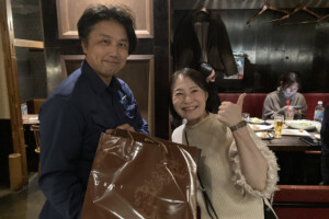 社長からマネージャーの近岡さんにスーツの誕生日プレゼントが贈られました!