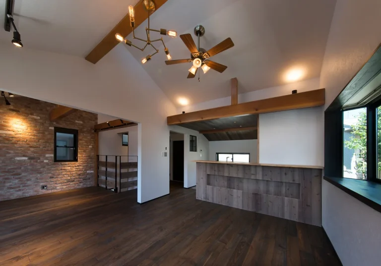 木やレンガといった強い素材感を白い壁と解放感ある天井が取り持ち、リビングを広々と見せています。